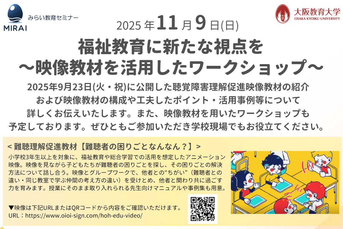 プログラム | (13:00 受付開始) 13:30 開会あいさつ・趣旨説明 13:35 映像教材の説明およびワークショップ ・2025年9月23日(火・祝)に公開した映像教材の紹介(構成や活用事例など) ・教材を用いたワークショップ(実際に教材に触れながら学べる体験) 15:30 終了 ※終了後、映像教材についての意見交換の場を設けます(30分程度/自由参加) |